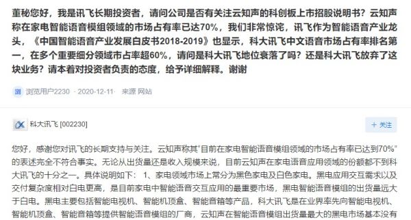 2020年12月13日,云知声IPO文件公布还不到一个月,科大讯飞在投资者交流平台上表示,云知声关于其语音病历市场、家电智能语音模组领域占有率高达70%的表述严重失实。科大讯飞对投资者回复中称,无论是在深度、广度还是营收规模上,科大讯飞在医疗、家电语音应用领域的智能语音应用,均远超云知声。