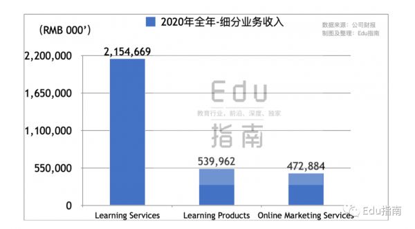 再回到有道公司整体的板块,包括学习服务learning service(上文的网课即在此范畴)、学习产品learning product、在线营销服务。2020年分别贡献收入21.5亿元、5.4亿元、4.7亿元。