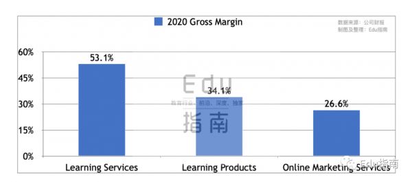 这三个板块的业务收入,当下呈现出越来越清晰的毛利率,以在线课程为主要形式的学习服务,毛利率达53%,学习产品、在线营销服务两项业务毛利率稍低,分别为34%、27%。