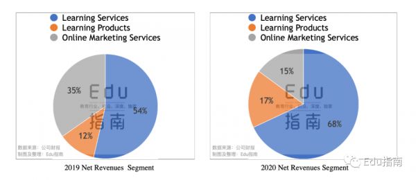与之对应的还有它们正在发生变化的收入占比:毛利率高的在线学习服务占比例正在上升,从2019年占净收入的54%,上升至2020年68%。毛利率最低的在线营销服务,占收入比降幅明显,从2019年的35%,下降至15%。