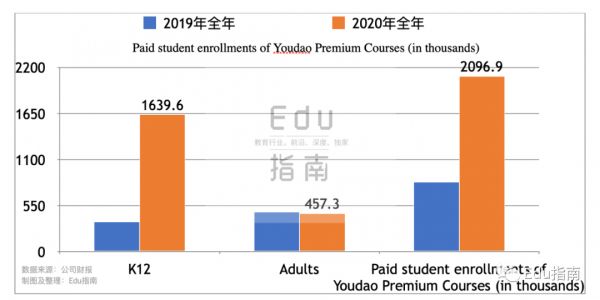亏损之外,对于有道来说,2020年付费学生数量的增长表现无疑是一个不错的成绩,付费学生从2019年83.3万学生,增长至2020年的209.6万。其中k12的增长更为显著,同比增长357%,付费学生数量超过163.9万。