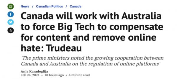 本周特鲁多还与莫里森举行会谈,两国总理一致表态将努力确保网络巨头为新闻付费,认为澳洲拟议的新法将“走向全球”,进而释放主权国家加强对互联网权利监管的信号。