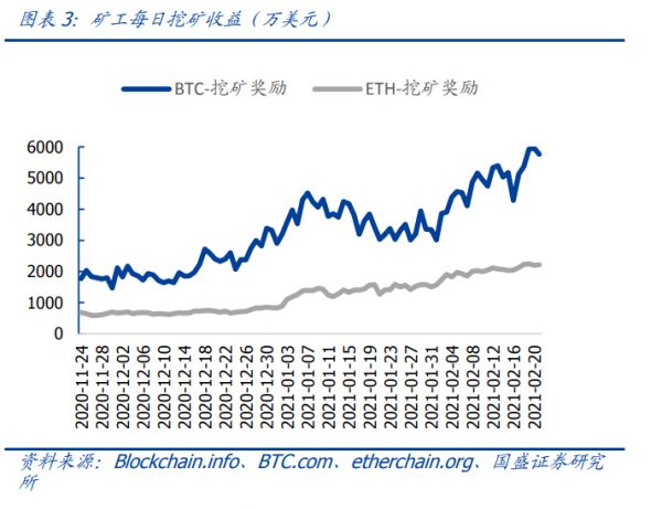 根据国盛证券2月22日发布的研报,从2020年11月24日起,不管是BTC矿工,还是ETH矿工,日均收益都在上升。