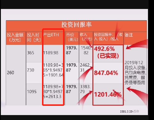 根据前文以太坊矿机厂商的计算,以1957.47美元历史高位计算,如果投入260万元人民币,投入时间为一年,一年可挖1189.98个以太坊,一年后收入为1540.82万元,投资回报率达492.6%。