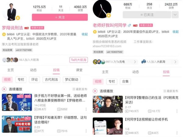 罗老师一条条5-15分钟有关刑法的讲解投稿,以及社区弹幕精辟而幽默的交流回复,才让B站有底气说出“学习,上B站”这类口号。也恰是基于此,罗老师获得了2020年度最高人气UP主,也带动了许多用户在B站探索“二次元”以外的世界。