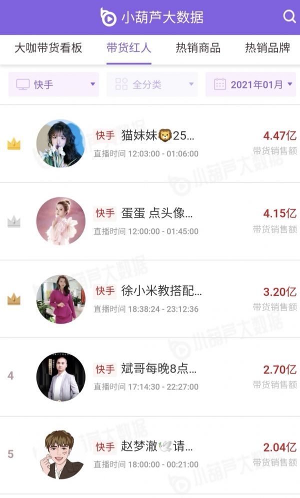 据小葫芦1月直播带货的最新数据显示,快手前五的主播里,蛋蛋、赵梦澈是东北人,猫妹妹大火前也长期在东北;抖音前五的主播里,罗永浩的老家是东北,而这TOP 10名单中,现在无一在东北带货。