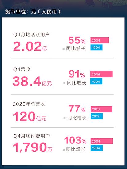 2月25日,哔哩哔哩发布2020年Q4和全年财报。财报显示,2020年哔哩哔哩(以下简称“B站”)总营收达120亿元人民币,同比增长77%,其中Q4营收同比增长91%,达38.4亿元人民币。核心指标增速超出行业平均水平、超出B站过往表现、超出外界此前预期,B站的2020年成绩单还算不错。
