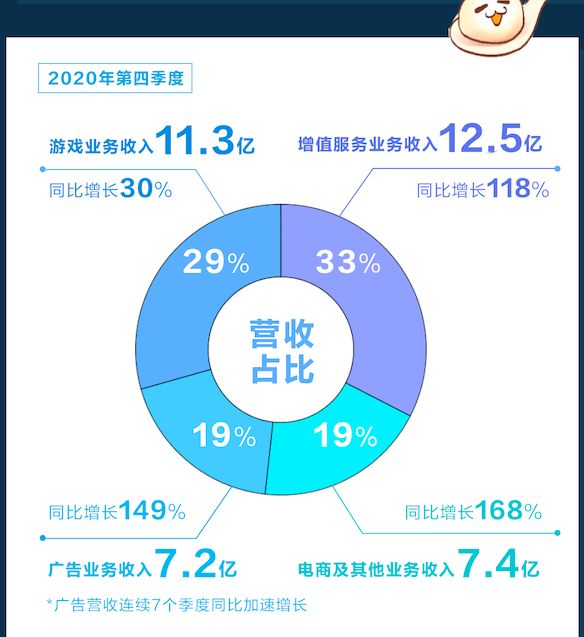 B站当前营收构成分为四部分:增值、游戏、广告与电商,Q4营收分别为12.5亿、11.3亿、7.2亿与7.4亿,占比分别为33%、29%、19%、19%,是为数不多的不对单一收入高度依赖的互联网公司。