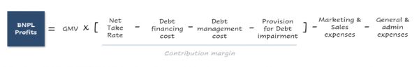 先买后付业务利润的计算公式:利润=GMV*(净佣金-债务融资成本-债务管理成本-债务减值准备)-销售费用-管理费用