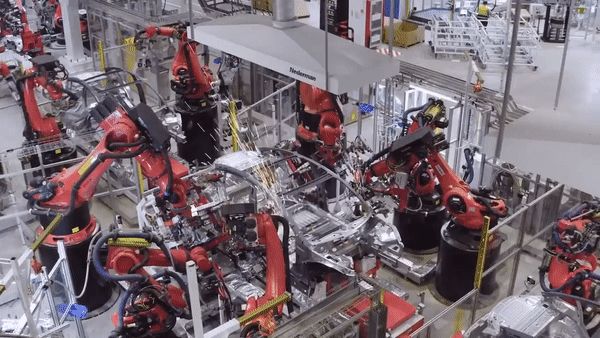 但区别于过去传统流水线上的劳动分工,让每个流水线工人熟悉自己负责的螺丝钉和零部件的结合方法,以此提升效率和产量。数字化时代下,特斯拉的劳动分工,不仅有操作工人,还有大量的高科技机器人,而后者是主力。