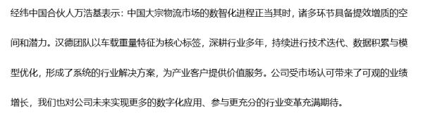 得益于产品和技术的优势,深圳汉德的产品可以较好地解决垂直行业内货物运输的痛点。苗少光表示,大宗商品运输中,水泥、煤炭和钢铁行业是目前产品主要落地的场景。