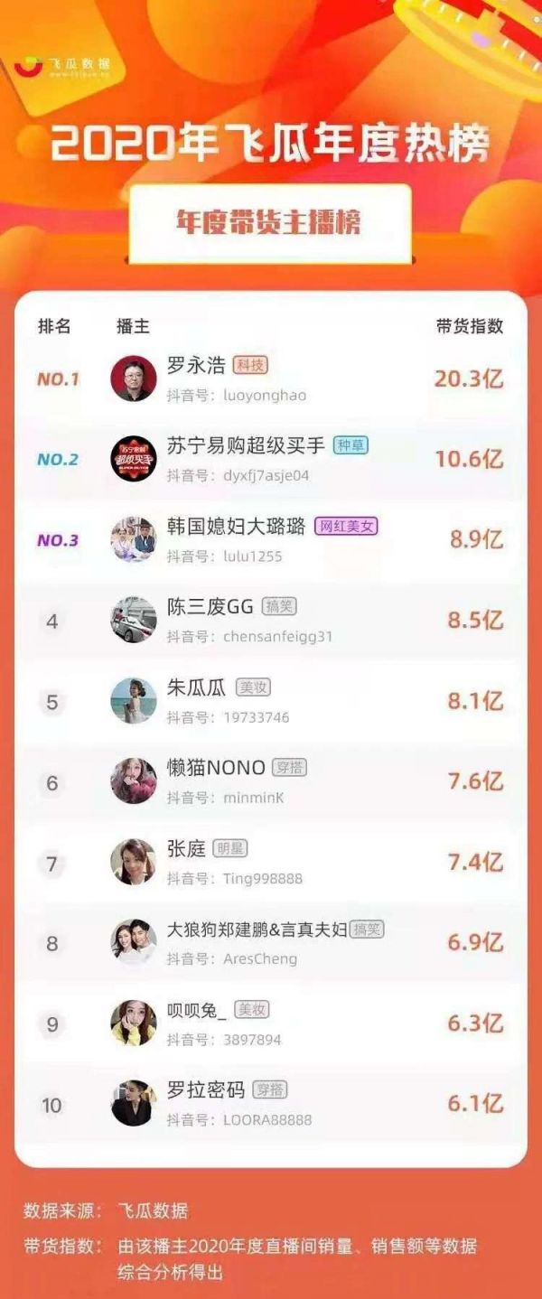 飞瓜数据显示,2020年飞瓜年度带货主播榜上,苏宁易购超级买手以10.6亿的GMV位列第二名,仅次于第一名罗永浩。