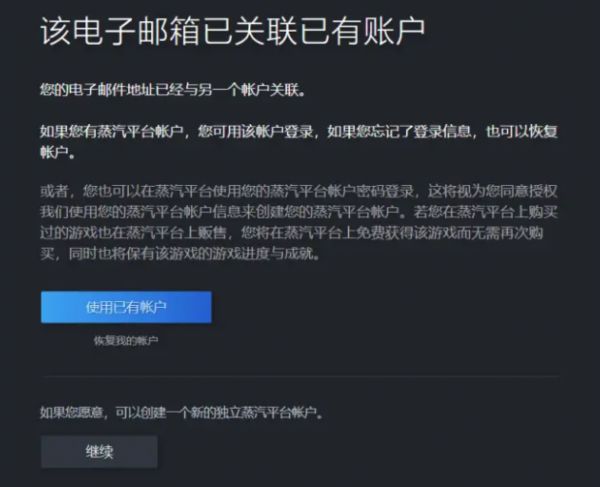 在已经运行了steam的情况下,蒸汽平台会提示已有另一版本蒸汽平台正在尝试启动,需要关闭后再试。国服与国际服双开,目前看来没戏。注册账号环节,如果使用已有steam账号的邮箱,蒸汽平台会提示该游戏已有关联账户,可以直接登录关联账户。