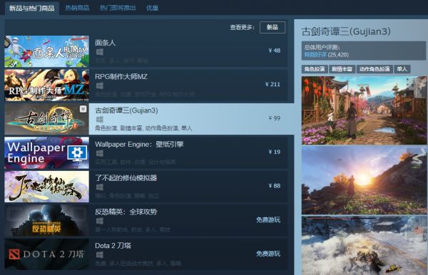 与云集全球诸多优质游戏的steam国际服相比,蒸汽平台更像是个“Mini”版。目前平台内上线游戏仅53款,其中包括曾引起过广泛讨论的独立游戏《了不起的修仙模拟器》,烛龙游戏多年前的旧作《古剑奇谭3》以及在春节前冲上全球热销榜的《戴森球计划》。