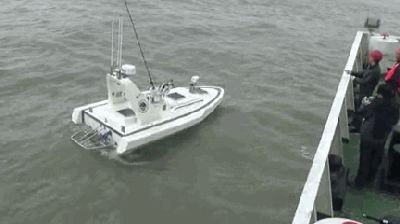 大船晃得很厉害,无人艇也晃得很厉害,让两边的吊钩结合对接,把无人艇吊上来,难度非常大。