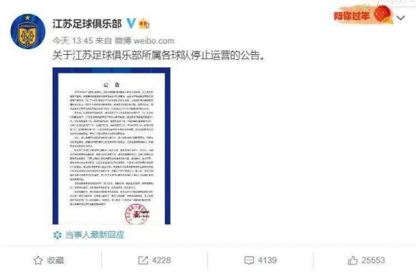 2月28日午间,江苏足球队正式宣布停止运营。来源:微博