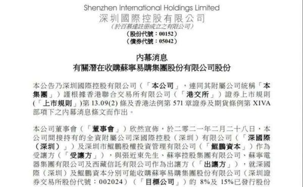 2021年2月28日晚,深圳国际控股有限公司(深圳国际)发布公告称,拟作价148.17亿合计收购苏宁易购23%股份。该交易受让方为深圳国际间接持有的全资附属公司深国际(深圳)和鲲鹏资本,出让方为苏宁创始人张近东、苏宁控股、苏宁电器和西藏信托。