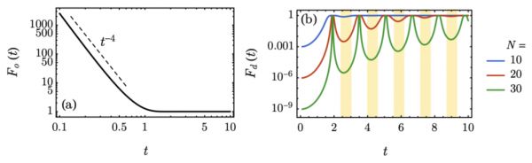 在相干哈密顿量演化下的有限尺寸系统中,受扰动的信息会出现周期性的反弹,进而导致Fd(t)的脉动行为。这很类似于化学中的“时钟效应”(clock phenomenon, 对这个现象感兴趣的可以观看这个视频:https://www.youtube.com/watch?v=WpBwlSn1XPQ)。不过,这种信息脉动的持续时间是依赖于系统尺寸的。表征信息脉动时长的特征时间尺度在td~ D1/6=2N/6这个量级。在这个时间尺度之前,我们可以抓住信息脉动尖峰与尖峰之间存在时间窗口期(如上图中黄色阴影所示)对与对角元素的观测量进行有效的预测,同时对非对角元素的观测量也达到有效的预测。