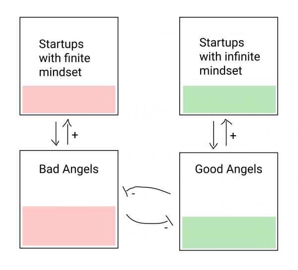 所以,正如你所猜测的那样,好的天使投资人和糟糕的天使投资人之间,以及有限游戏心态与无限游戏心态的创始人之间存在着交叉催化的关系。每一对都会互相吸引,原因显而易见。但同样重要的是,这两种天使投资人相互排斥。如果你有足够数量的好的天使投资人,那么糟糕的天使投资人就会被赶走(他们不再被邀请参加交易)。而如果你有足够数量糟糕的天使投资人,好的天使投资人就会离开(他们不会有任何乐趣,所以他们会去寻找其他的爱好)。