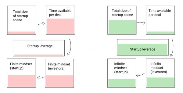 答案其实很简单:生态系统中的创业公司越多,实时发生的投资交易越多,你考虑任何一笔交易的时间就越少,不管有多少投资人,这完全是创业公司数量的函数。而当你只有很少的时间去评估每一笔交易时,你只有时间去问:“什么能做对”。而这是一个以创业公司的条件为前提的谈判。你只有时间去问,创始人是谁,他们的成长速度如何,谁在投资。换句话说,“你是不是在玩无限游戏,你会不会有赛道去做?” 这些都是正确的问题。
