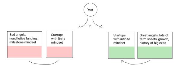 但如果你成为一家以里程碑为导向的公司,你就在不知不觉中毁掉了把VC的钱投入到真正的工作中去的能力,在加州的创业公司可以做到这一点。甚至在你拿VC的钱之前,通过成为一家里程碑式的公司,并学习如何说话和行动来突出这些里程碑,并靠这些里程碑筹集资金,你将优先吸引糟糕的天使投资人,并让好的天使投资人失望。好天使投资人在这样的环境中根本不会有任何乐趣:他们找不到他们想要玩的无限游戏,所以他们根本不会玩。所以早期阶段的融资环境就会有大量错误类型的资金:也许是善意的,但对创业公司来说是有害的。所以创业公司一开始就步履蹒跚,很可能永远无法恢复。
