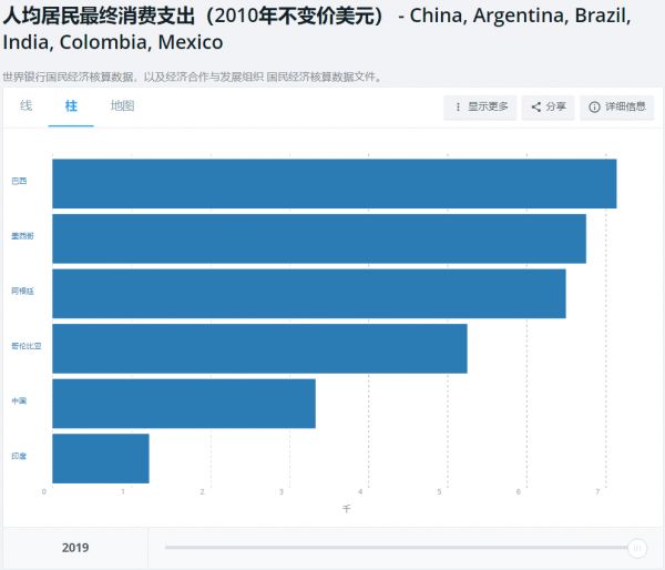 2019年拉美四国和中国、印度的人均居民最终消费支出