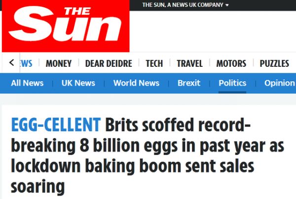 @环球时报【英国人吃鸡蛋数量创下历史新高,一年吃掉近80亿个鸡蛋】新冠疫情下的长期封锁让不少英国人变成“烘焙达人”,这也导致作为烘焙原材料之一的鸡蛋销量飙升。据英国《太阳报》2月28日报道,2020年英国人吃掉了近80亿个鸡蛋,总价值近12亿英镑(约合108亿元人民币),创下历史新高。