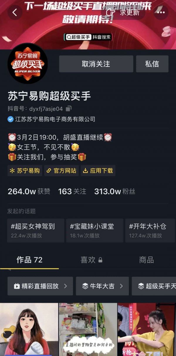 常驻于带货榜前五的苏宁易购是抖音品牌直播的标杆案例之一。2020年7月,苏宁易购宣布与抖音电商达成合作,苏宁输出供应链服务能力,全量商品入驻的抖音小店,同步提供物流和售后服务体验。其“超级买手”直播间累计开播超过150场,总GMV超过18亿。如同快手与京东达成合作,苏宁易购等平台的入驻也正在迅速补充抖音电商在供应链端的短板。