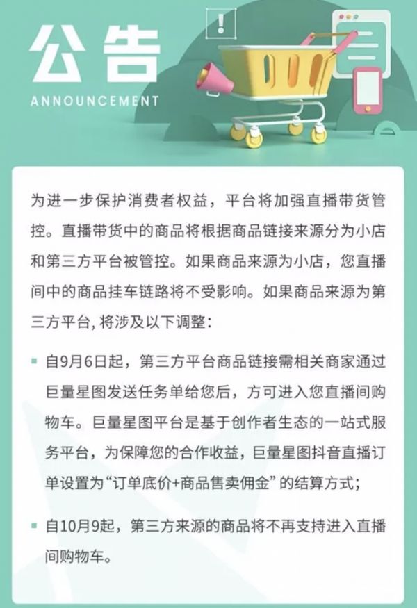 上述消息宣布仅不到一周,抖音再次出台新政策——自10月9日起,直播间购物车将切断所有第三方来源的商品链接。