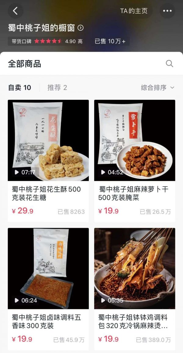 素人主播“蜀中桃子姐”则是头部矩阵的代表案例之一。她从2018年开始在抖音分享美食教程与日常生活,至今已有2113万粉丝。2020年3月,桃子姐自创调料品牌,开始在直播间带货自家的钵钵鸡调料包。根据飞瓜数据,“蜀中桃子姐”直播间在今年1月的预估销售总额达1491万。