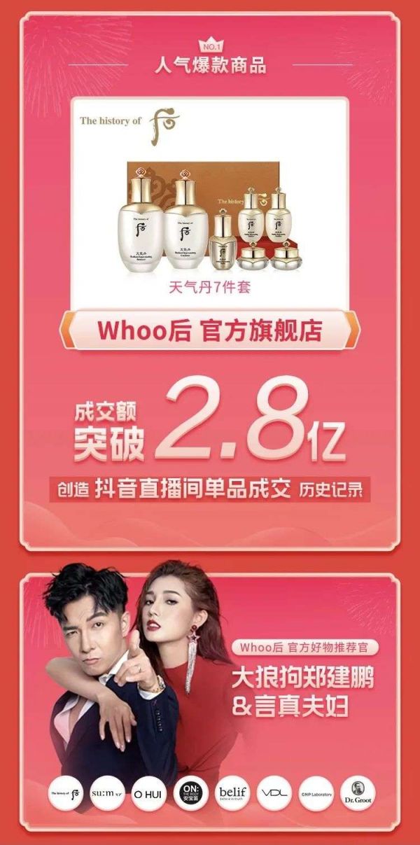 单品直播则是反复销售一个到几个“拳头产品”,再不断地从公域洗流量,灌入直播间促成转化。今年1月8日,抖音达人“广东夫妇”在一场直播中卖出近20万套Whoo后天气丹,单品GMV突破2.8亿,创造抖音直播间的单品成交记录。