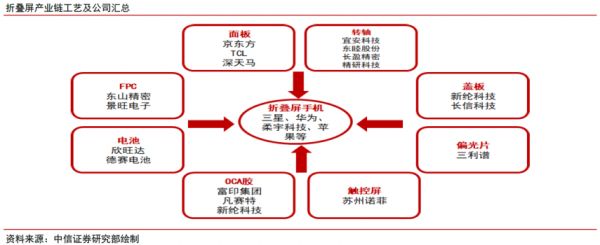 这些产业链企业分布在材料、显示屏、精密组件、电子电路及生产制造设备等各个领域,由这些领域各厂家协同组成的供应链,是搭建折叠屏手机技术落地的重要基石。