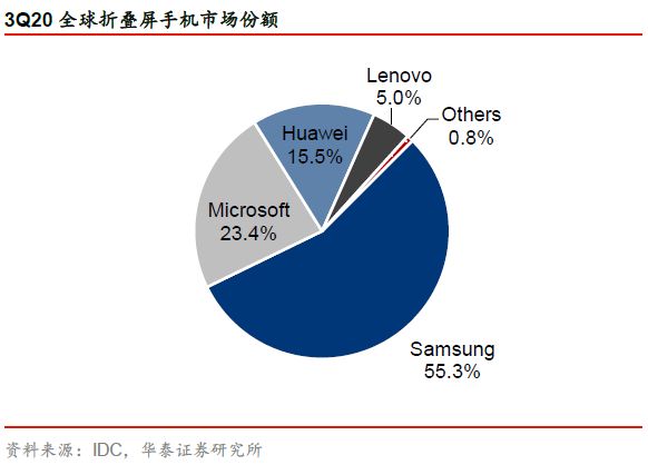 2020年第三季度,全球折叠屏手机出货量已达70.66 万部,这一数据在2019年第三季度,仅为4.35万部。其中三星以55.3%的市场份额处于领先地位。在2019年,全球折叠屏手机出货以内折为主,但是到2020年,全球折叠屏手机中内折、外折、翻盖均实现较高出货量。
