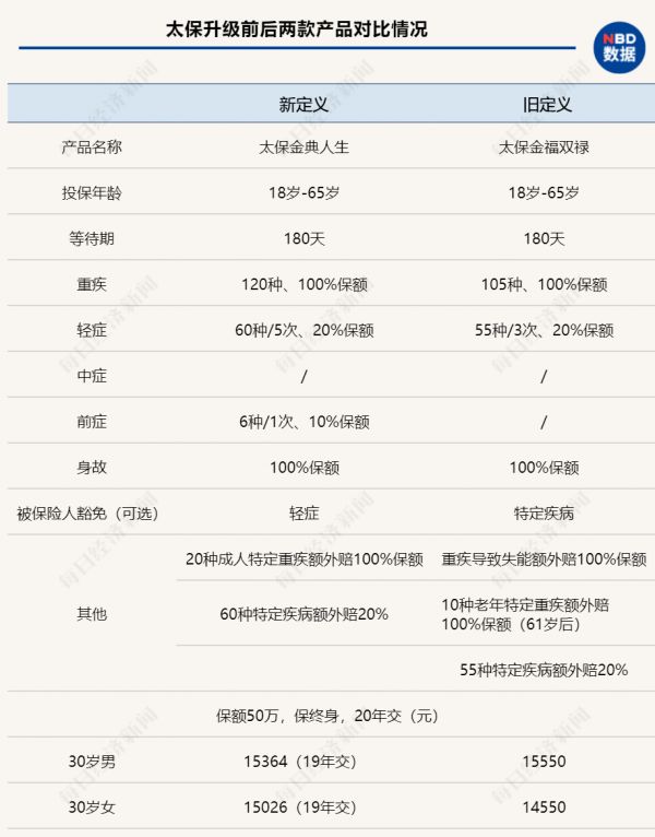 另一家上市险企太保则推出了新定义的金典人生。与旧定义产品太保金福双禄作对比,保障的升级部分体现为:重疾病种由原来的105种扩展至120种;轻症病种由原来的55种扩展至60种,同时赔付次数由原来最高3次提升至最高5次,但赔付的比例仍维持原来的20%不变。