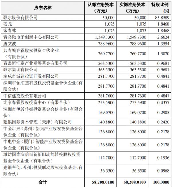 其中,青岛微电子创新中心有限公司为国有独资,由青岛市崂山区财政局持股100%,其以5.5亿元成为本轮出资额最大的战投方。荣成市城建投资开发有限公司同样为国资背景,由荣成市国有资产监督管理局持股100%,而荣成市政府与歌尔集团合作建设的荣成歌尔产业园在2020年10月已正式启用。