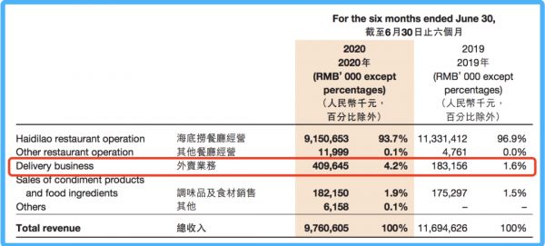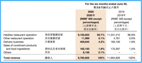 2020年中报显示,海底捞的营收分五个部分:餐厅经营、其他餐厅经营、外卖业务、调味品及食材销售、其他。在各项收入中,餐厅的经营收入毫无疑问是最主要的收入来源,贡献了2020年上半年总收入的93.7%,达到91.51亿元。