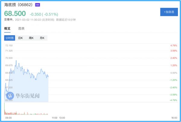 3月2日开盘,海底捞港股低开,中间小幅回落后继续攀升。截至上午收盘,海底捞报68.5港元,降幅0.51%。