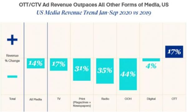 在美国等游戏出海的重点市场,智能大屏正在获得越来越多的关注和青睐,成为触达消费者的重要渠道。萃弈最新发布的报告中提到,根据商业智能公司 SMI 所提供的数据,2020年1月至9月美国智能大屏(CTV/OTT)广告收入超过所有其他媒体,且是唯一录得同比正增长的渠道。另外,在针对150位美国营销从业人员的调研中,95%的受访者表示智能大屏渠道成功实现了广告投放活动的 KPI。