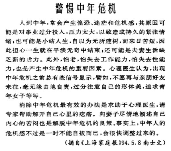 目前从公开资料中,能够搜索到中文世界里最早的“中年危机”出现在一篇刊登于 1994 年《上海家庭报》上的小鸡汤里。之后的几年里,中年危机在国内的使用与 70 年代美国媒体提到中年危机一样带有性别色彩,无外乎《帮助丈夫渡过中年危机》(1994)、《当中年危机困扰你的丈夫时》(1995)、《男性的中年危机》(1997)等。