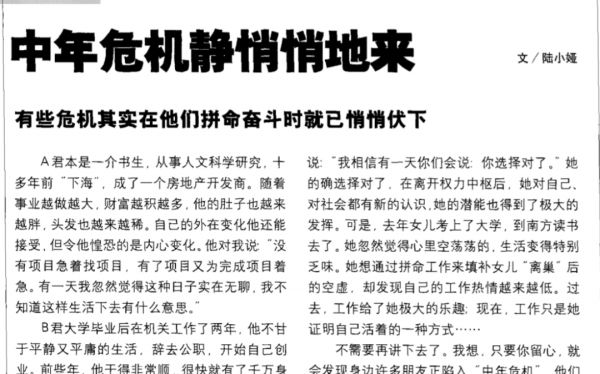 到 2000 年,中国企业家杂志上的一篇《中年危机静悄悄地来》将这一焦虑拓展到了婚姻家庭以外的职场与人生发展上。