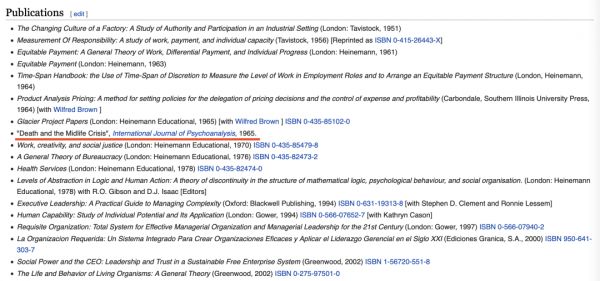 [7] Stuart Lavietes. (2003). Elliott Jaques, 86, Scientist Who Coined 'Midlife Crisis'. The New York Times, (March 17, 2003), Section B, Page 7.
