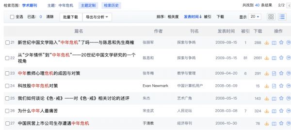 在 90 年代才建立起完整学科体系的中国甚至没怎么仔细研究过“中年危机”。中文核心刊物上只有 40 篇相关论文,其中还有不少是化用中年危机来形容企业和经济的发展。