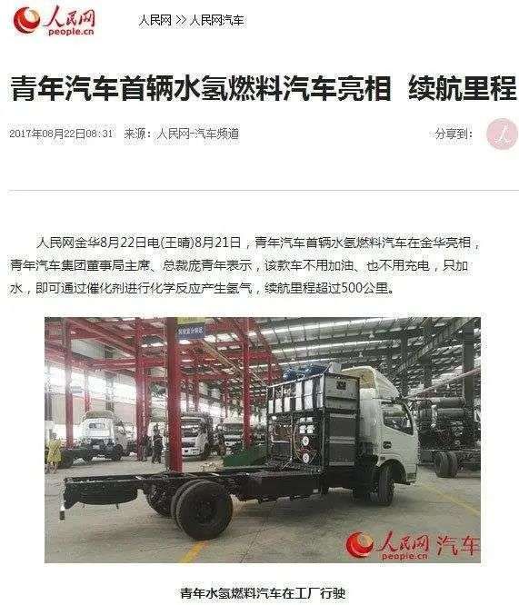 其实青年汽车早在2017年8月就发布了全球首辆水氢燃料汽车,并称该车不加油,不充电,只加水,续航里程就能超过500公里。
