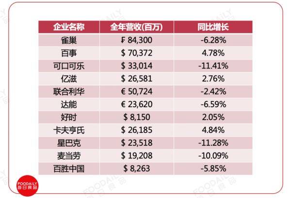 Foodaily搜集了雀巢、百事、可口可乐、亿滋、联合利华、达能、好时、卡夫亨氏、星巴克、麦当劳、百胜中国等11家食品饮料企业的2020年度全年财报,并对它们的全年营收进行了汇总。