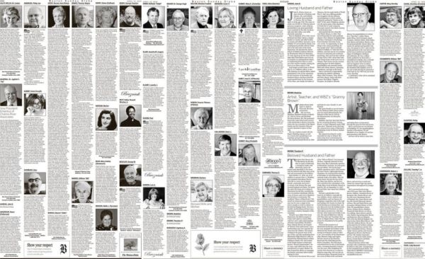 2020年4月,在许多美国人仍未意识到新冠的严重性时,《波士顿环球报》用16个版面刊登讣告。这些讣告由逝者的亲人或好友提交给《波士顿环球报》,主要来自于该报所在的马塞诸塞州,以及希腊、爱尔兰和意大利等国家。