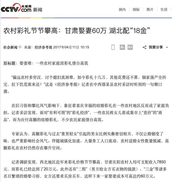 今年“新华视点”的文章热传的时候,我跟多地朋友交流过。江西的朋友说,他家亲戚当中有七八个婚龄男子找不上媳妇,年龄最大的都三十七八岁了,有的是家里没在县城买楼,有的是男孩没读什么书,人很木讷,不具备女性吸引力;江苏的朋友说,苏北农村的男子娶妻也很难,父母如果不是生意人或有公职,家境如果稍微差点,小伙子没文凭没手艺,那都是老大难,这样的家庭如果家里有两个儿子,媒人都懒得上门。他们村很小,他一口气给我列了村里5名近30岁的大龄男子,其中一名28岁的男子昨天“小见面”,见面礼之“重”让我这个西北人感到震惊。
