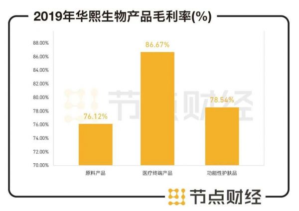 据爱美客财报显示,按照产品分类,2020年溶液类注射产品和凝胶类注射产品的毛利率分别为92.85%和92.27%。而相比之下,2019年华熙生物的医疗终端产品毛利率为86.67%。