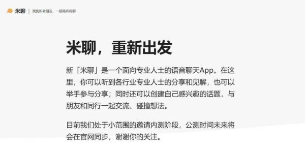 复活的米聊,已经开始内测。据官网介绍,在新米聊内,用户可以听到各行业专业人士的分享和见解,也可以举手参与分享;同时还可以创建自己感兴趣的话题,与朋友和同行一起交流、碰撞想法。