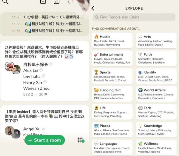 Clubhouse通过邀请制形成“精英化”标签,同时通过各个领域的名人、意见领袖的演讲,吸引更多对垂直内容感兴趣的用户,逐渐构建起一个语音社区。