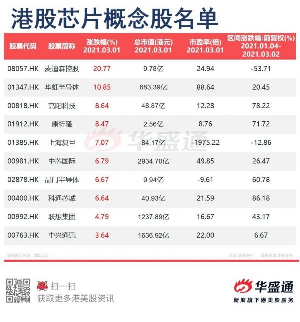 受上述消息影响,3月1日港股半导体概念大涨,华虹半导体(01347.HK)大涨10.85%,中芯国际(00981.HK)、上海复旦(01385.HK)涨近7%。